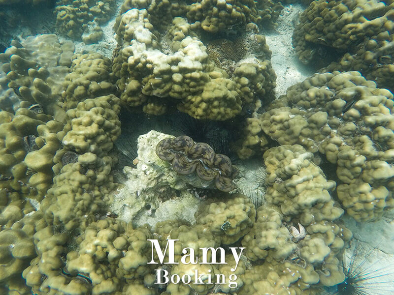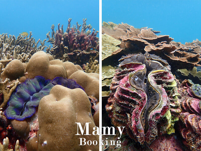 There are several sea urchins over here. It’s quite risky when swimming near them, but we just cannot resist the beauty of the underwater. We dive further to see sea anemones, giant clams and diverse fish.